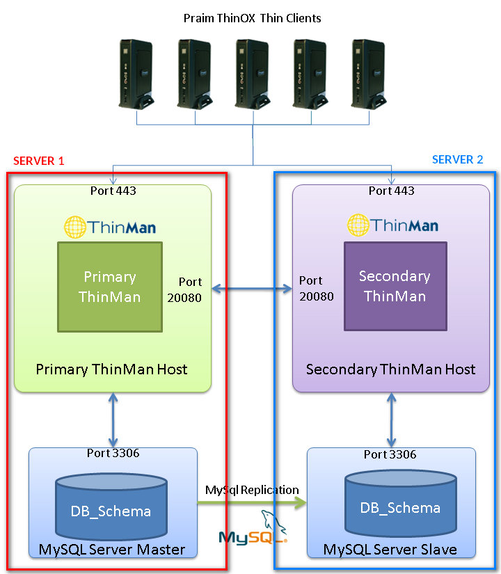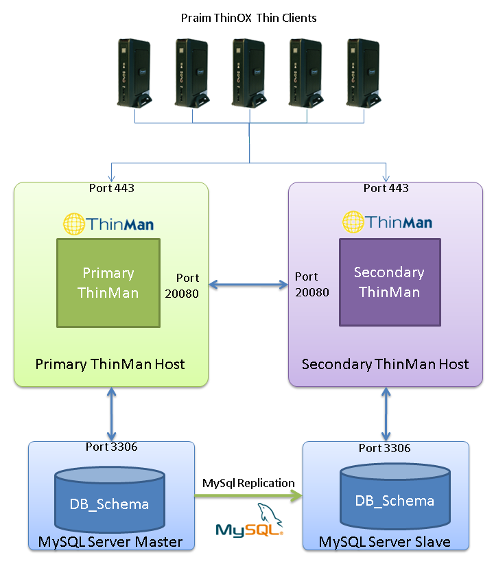The picture below shows the ThinMan Architecture with high availability (HA).This conceptual schema can involve up to 4 different servers (one for each distinct component: ThinMan Primary Server, ThinMan Secondary Server, MySql Database Master, MySql Database Slave).